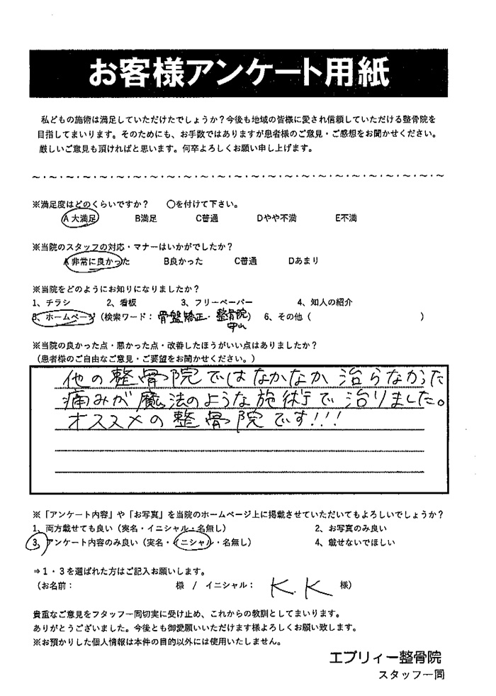 他の整骨院ではなかなか治らなかった痛みが魔法のような施術で治りました。